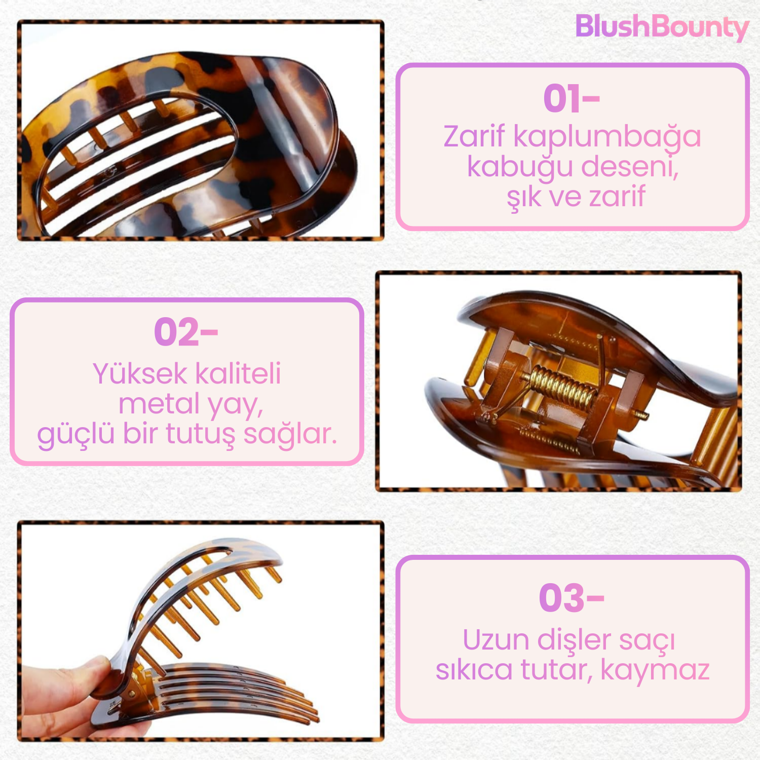 Tokalarımız yüksek kaliteli materyalden üretildiği için güçlü bir tutuş sağlar. Günlük kullanımda kaymaz, saçınızı sıkmadan sabit tutar.